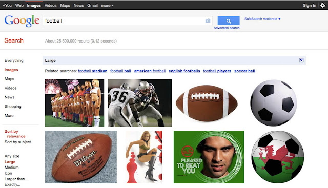 Searching Google Images today for 'football' we spotted this picture of 16 girls in international football kits first on the list. Well done Google, nice work! and this was with 'safe search' on at moderate level and picture size 'large'.