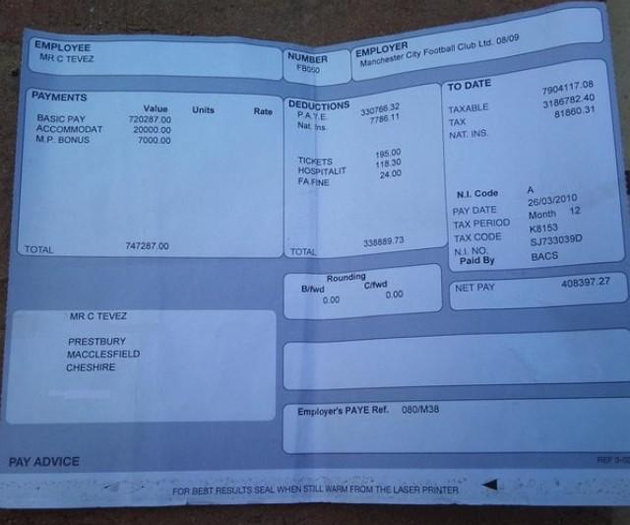 The payslip tells us that Tevez was paid just under £8m, but handed over nearly £3.3m in tax and national insurance. That left him just over £4m to survive on for the year - more than enough to keep him in golf balls and speeding ticket lawyers!